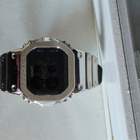 Selger en rå og solid Casio G-Shock GMW-B5000D-1ER i hel stål (full metal). Dette er premium-versjonen av den klassiske firkantede G-Shocken – med skrukasse i stål, safirglass og avanserte funksjoner.