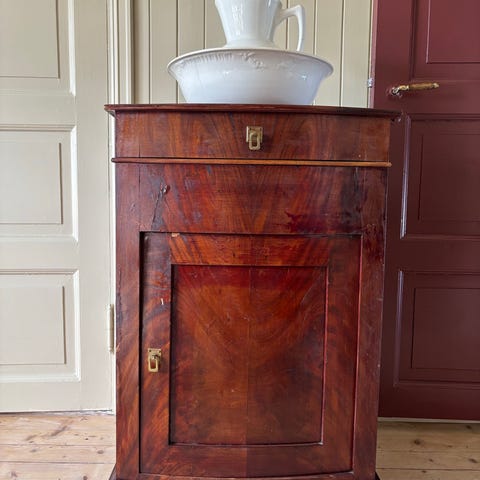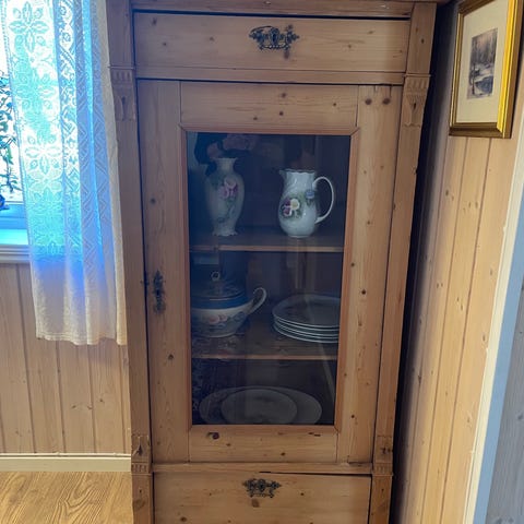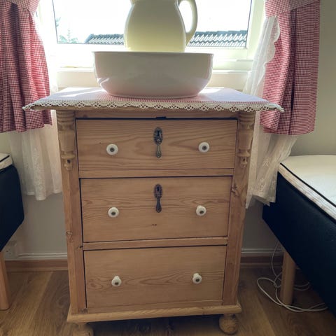 Vaskeservant i heltre furu med én skuff og skap. Tilhørende fat og mugge selges samlet pga flytting.