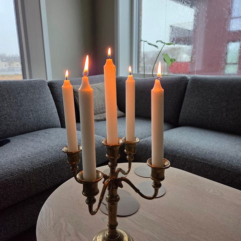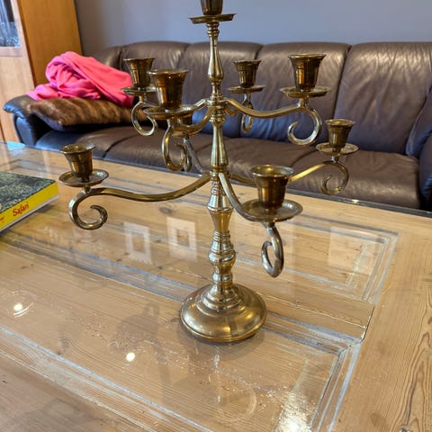 Materiale: Støpt messing med synlig grønnaktig irring/patina i lyskoppene.