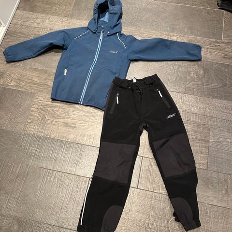 Buksene er i strl 4, men de passer 5 åringen akkurat. Jakka er i 110.
