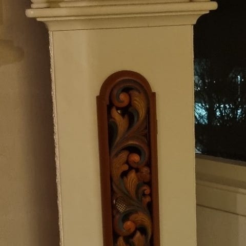 Gulvur i tre med rosemalt dekor. Klokken har et høyt, buet toppstykke med utskårne og malte detaljer. Urskiven er rund med romertall og dekorative blomster rundt. Uret fungerer dessverre ikke. Selve skapet er malt i flere farger, med rosemaling på frontpanelet både øverst og nederst. Passer som gulvstående klokke i stue, gang eller andre oppholdsrom. Årstallet 1945 er malt på fronten under urskiven. Det er fra en gammel gård i Trøndelag, hvor det stod i finstuen. Høyde på klokka er 220cm, og bredde på det bredeste er 48 cm. Må hentes på 2165 Hvam i Nes kommune. Det er like ved Neskollen, og det er ca 15 km fra Jessheim.