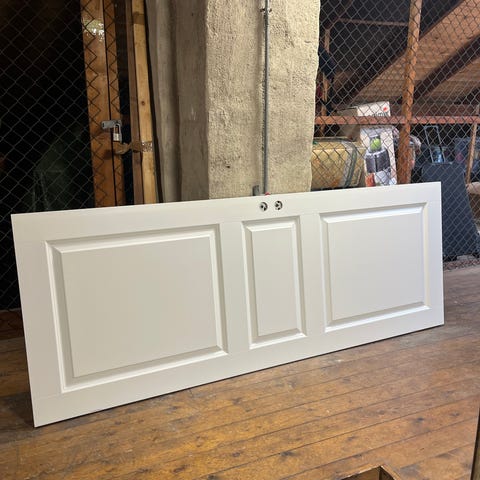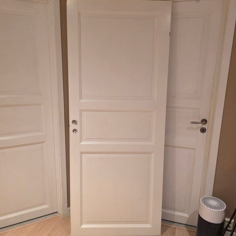 Innvendig dørblad med tre speil i grå farge. Døren har klassisk profilert utforming og er egnet til bruk som innerdør i bolig, for eksempel mellom rom eller som skap- eller boddør. Materialet fremstår som malt tre eller trefiber. Nøyaktige mål og tykkelse er ikke oppgitt og bør kontrolleres før montering.