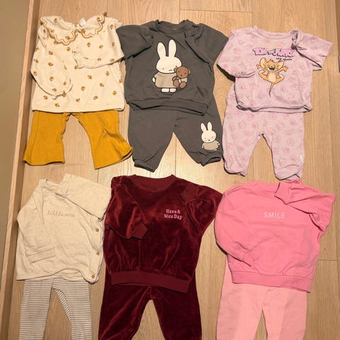 9 bodyer (4 omslag og 5 vanlige), 4 strømpebukser, 8 bukser (en av de med matchende lue, den med hjerter), en sparkedress, to pysjer (en med fot), 2 sett med bukse og genser, 2 gensere, en cardigan, 4 kjoler. Siste bilde er ull: en sparkedress, 3 bodyer, en bukse og en strømpebukse. Fra Joha, Newbie, HM, Lil'Atelier, Tommy Hilfiger, Ralph Lauren, MarMar, Nameit, Tiny One, Cubus, Lindex og Reflex.