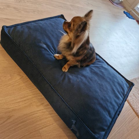 Hunter hundemadrass i rektangulær fasong. Sengen har myk, vattert liggeflate og faste, polstrede kanter. Trekket har et småmønstret tekstil i beigetoner. Egnet som liggeplass for hund innendørs. Passer til stor/ mellomstor hund, 100 x75cm. Kostet 1550,- ny.