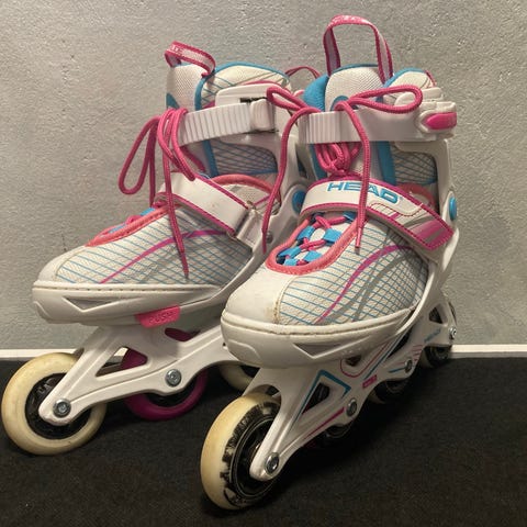 Skøyter for barn i rød farge med justerbare reimer. Skøytene festes utenpå sko ved hjelp av stropper. Egnet for mindre barn som skal øve på å gå på skøyter på isen. Laget i metall og plast med tekstilreimer for feste.