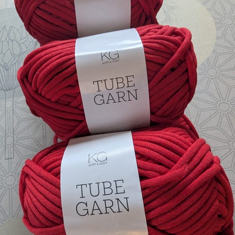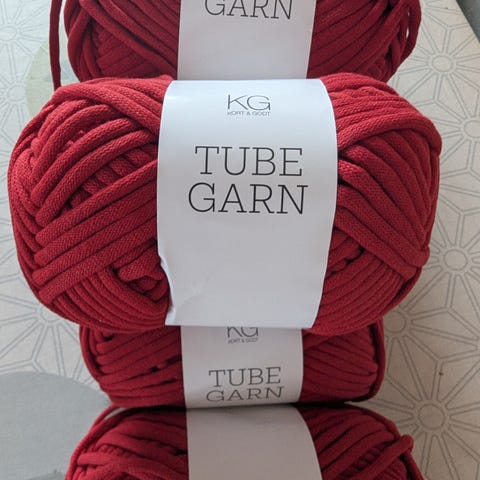 Selger 5 Lyse blå og 1 hvit med Tube garn fra kort og godt, 4mm, 100gr nøster, 60 meter, 68% bomull og 32% nylon, kan vaskes på 30g, kr 59 pr bunt eller 300 for alle+ porto