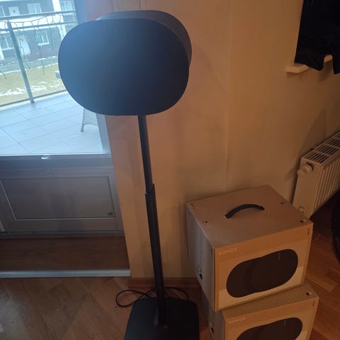 Høyde inkl høyttaler 90cm. Ikke justerbar høyde. 2 stk Sonos Line-In adapter 3,5mm til USB-C følger med.