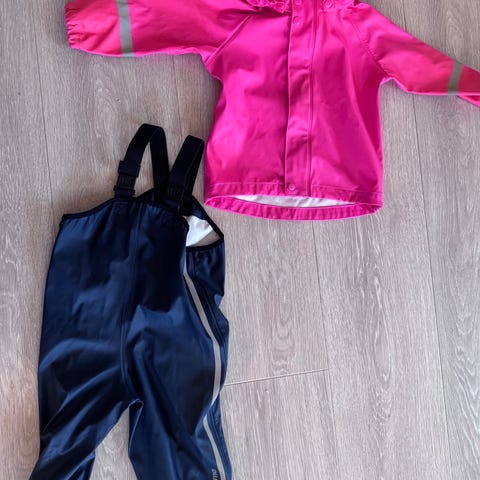 - regnjakke (lyseblå med mørkeblå ermer) str 90 (men passet til ca 3,5 år). Avtagbar hette, trykknapper og glidelås, refleksdetaljer på det ene ermet. God kvalitet, lite bruksmerker, ingen flekker eller skader.