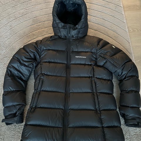 Peak Performance dun vinterjakke for dame i størrelse L, den er liten i størrelsen og fremstår som en M. Modellen har hette og glidelås i front. Passer som overgangsjakke og vinterjakke.