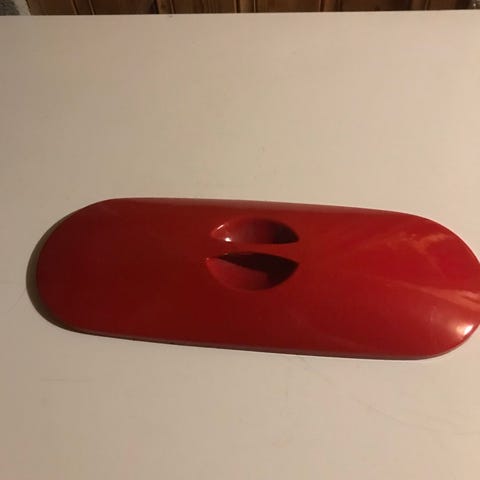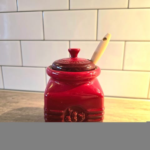 Le Creuset krukke med lokk i rød keramikk. Kvadratisk form med avrundede kanter og rillet dekor på sidene. Egner seg godt til for eksempel hjemmelaget syltetøy