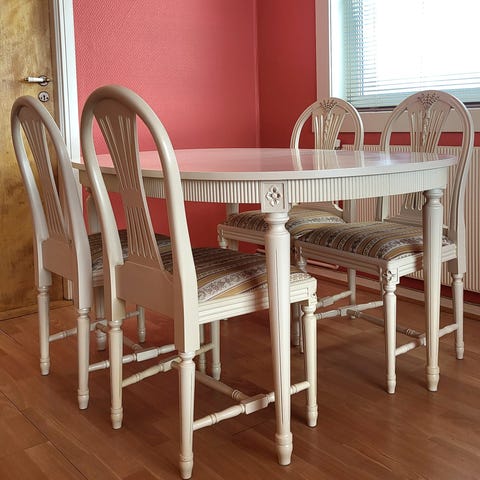 Lyst i en nyanse av hvitt / antikkhvit med fine utskårne detaljer. Helt og fint, med bruksmerker etter mangeårig bruk.