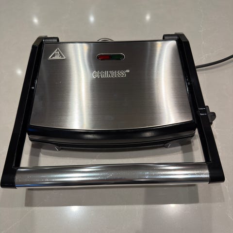 Princess toastjern i svart utførelse. Apparatet har plass til fire trekantede toastskiver om gangen, med faste plater som former og deler brødskivene. Utsiden har indikatorlys for oppvarming og klar-til-bruk. Egnet til enkel tilberedning av varme toast og sandwicher på kjøkkenbenken.