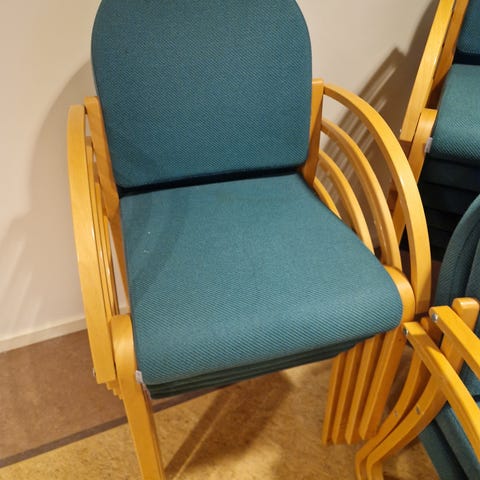 Gir bort seks solide, stablebare stoler i formpresset tre. Stolene er av god kvalitet, men stoffet er slitt på alle og må trekkes om.