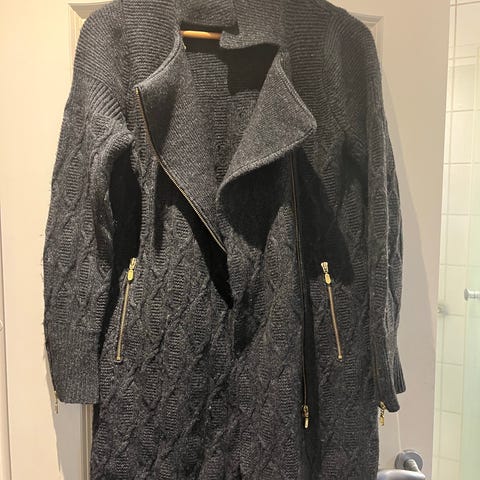 Jakken er i gråmelert ullblanding med ribbestrikkede felt nederst og i front. Den har hel glidelås foran, høy krage og to glidelåslommer i siden. Lengden går ned over hoftene, og passformen er lett innsvinget. Egner seg som ytterjakke i kjøligere vær og til hverdagsbruk. Lengde 90 cm.