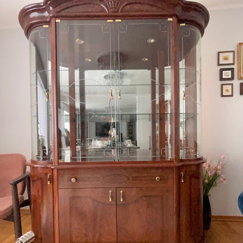 Vitrineskap i mørkebrunt treverk med buet front og utskårne ben. Skapet har to glassdører i front og glass i sidene, som gir god innsyn til innholdet. Innvendig er det flere glasshyller som egner seg til oppbevaring og utstilling av servise, glass og pyntegjenstander. Skapet plasseres frittstående mot vegg og passer i stue eller spisestue der man ønsker oversiktlig og beskyttet oppbevaring.