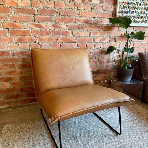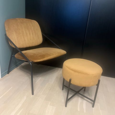 Enkel og dekorativ loungestol med champagnefarget velourstoff.