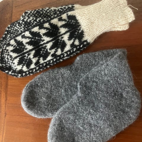 Marius ullvotter og pannebånd i 100% ren ull strikket i Rauma Vamsgarn selges. Nydelig gråblå bunn med okerfarget kant og hvitt mønster, de er tykke og myke. Pannebåndet kan også brukes som bøff.