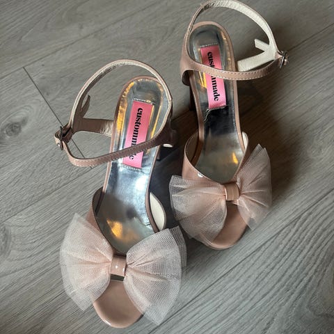 Custommade Melody Tulle Bow i størrelse 41. De har åpen tå med platå og høy hæl. Skoene har ankelrem med spenne og stor sløyfedetalj i tyll foran. Fargen er lys rosa/nude.