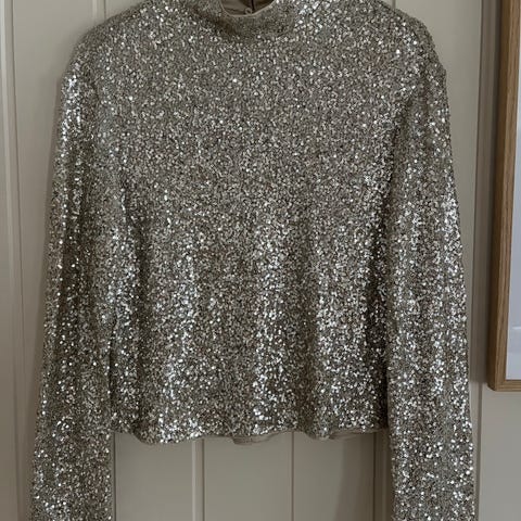 Toppen er i sølvfarge med paljettlignende overflate og lange ermer. Materialet er hovedsakelig polyester. Den har rund hals og åpning med knapper bak i nakken. Egnet som pen- eller partytopp.