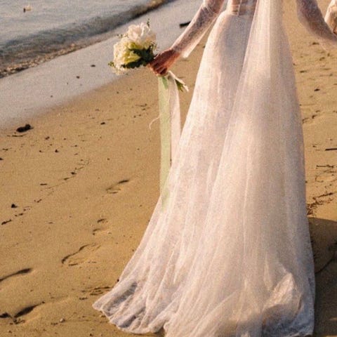 Brudekjole str M – med sort broderi og markant slep