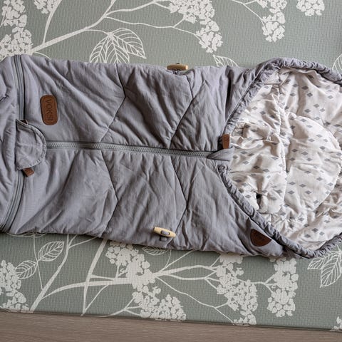 Noe misfarging i stoffet nederst på posen foran, se bilde. Litt rifter i stoffet bak ved festet, se bilde. Ellers hel og pen.