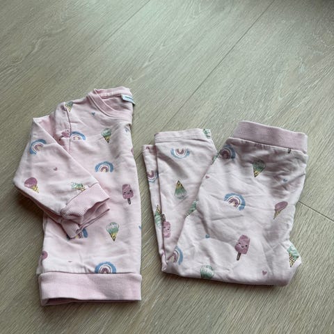 Lindex pysjamas for jente i størrelse 98. Sett med langermet overdel og lang bukse. Pysjamasen er laget i bomull og har flerfarget motiv med enhjørninger, hjerter og stjerner på lys bunn. Myke mansjetter ved ermer og ben for bedre passform og komfort.