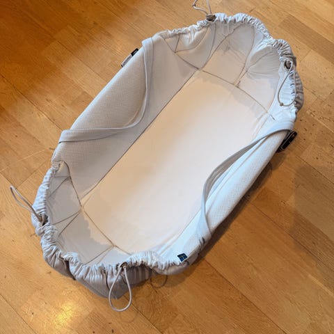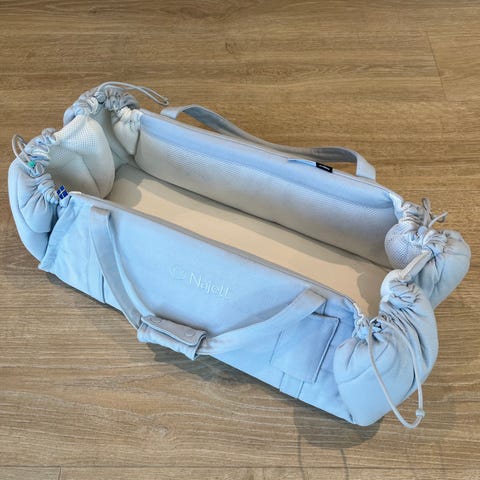 Najell SleepCarrier babynest i svart med lys innside. Babynestet har bærehåndtak og justerbare snorer i endene for å kunne tilpasses barnets størrelse. Myke, polstrede kanter gir en avgrenset liggeflate for baby. Inkluderer løs, lys madrass/innlegg som kan tas ut for rengjøring. Egnet til bruk som liggeplass for spedbarn hjemme eller på reise, og kan bæres ved hjelp av håndtakene etter produsentens anvisninger.