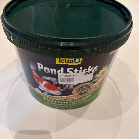 Selger flere bokser med fiskefôr til akvarium og dam.