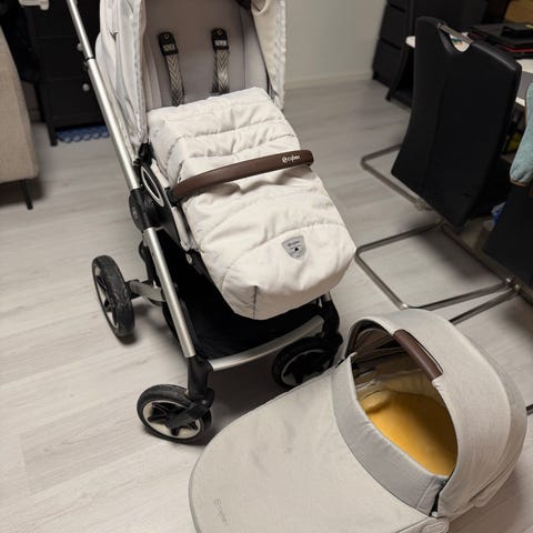 Cybex Talos s Lux i fargen taupe/seashell beige. Sittedelen er helt ubrukt med lappen på, mens understellet er pent brukt siden rett før jul til korte turer, sovestunder under tak og har blitt oppbevart inne ellers. Ingen skader eller synlig slitasje.