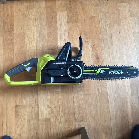Ryobi OCS1830 kjedesag med 30 cm (12") sverd og kjede. Modellen har børsteløs motor og kjedestramming via justeringshjul på siden. Egnet til kapping av ved og mindre trær. Kjedesagen er batteridrevet og inngår i Ryobi-systemet for 18V-batterier (batteri og lader følger eventuelt med etter egen opplysning i annonsen).