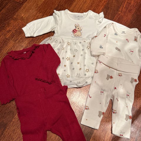To sett fra Name it og KappAhl + siklesmekke fra Name it. Begge settene er brukt én gang av et barn. Fine plagg til babyens første jul.