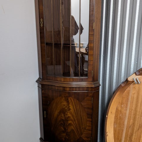 Skeidar vitrineskap i eik.Skapet har overdel med glassdører og flere hyller til oppbevaring og utstilling av servise, glass eller pyntegjenstander. I underdelen er det tette dører med hylleplass samt skuffer til bestikk eller småting. Klassisk utførelse med profilert topp og detaljerte fronter. Passer til stue eller spisestue som oppbevarings- og utstillingsskap. Skapet kan deles i to deler.
