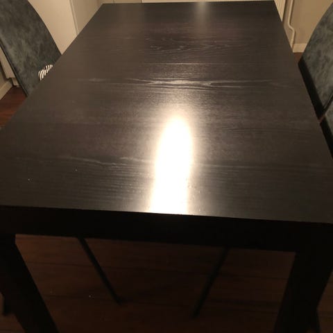 Spisebord i svart tre med rektangulær bordplate og rette ben. Bordplaten har tydelig trestruktur og består av flere felt. Egnet som spisebord i kjøkken eller spisestue, og har plass til flere stoler rundt bordet avhengig av ønsket møblering.