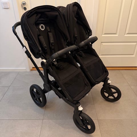 Selger Bugaboo Donkey 5 tvillingvogn. Pent brukt og i god stand. Alt fungerer som det skal. Kjøpt ny av oss våren 2023, tatt i bruk høsten 2023. Svart understell og sittedel/bagdel og kalesjer i fargen grey melange.
