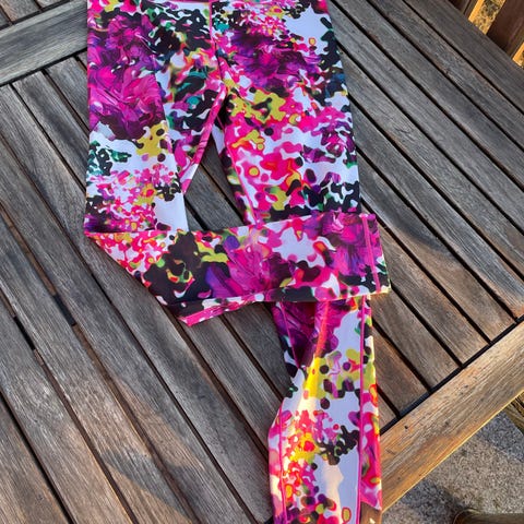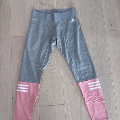 Adidas treningstights for dame i størrelse M. Tightsen er mørkerød med hvite striper langs sidene. Den har bred, elastisk linning og er laget i et tettsittende, elastisk materiale som egner seg til fitness og annen trening. Lengden er full lengde ned til anklene.