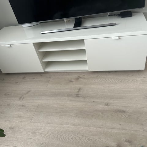 Selger en pent brukt BYÅS tv-benk / skjenk fra IKEA i hvit høyglans. Den har et par veldig små merker (se de to siste bildene), men er ingenting man ser på avstand. Super lagring.