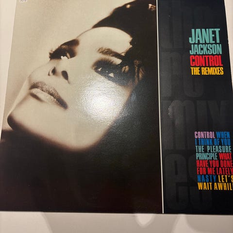 Janet Jackson Control LP vinylplate med rød forside og grafisk design. Albumet inneholder blant annet sporene «Control», «Nasty», «What Have You Done For Me Lately», «When I Think Of You» og «Let’s Wait Awhile». Utgivelse på A&M Records.