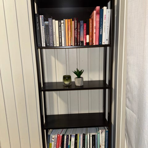 Selger en flott og solid bokhylle i mørk grå/svart utførelse.