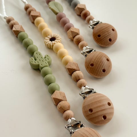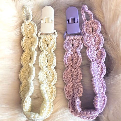 Heklet smokkesnorer med treklips beige og rosa