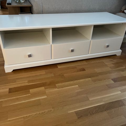 Tv-benk gis bort, den er foliert og hvit under folien. Folie på vinduene også, de er frostet bak. Aner ikke hvor stor den er, har ikke noe å måle med 😁 TVen over er 177 cm bred. Ca 2 meter bred.