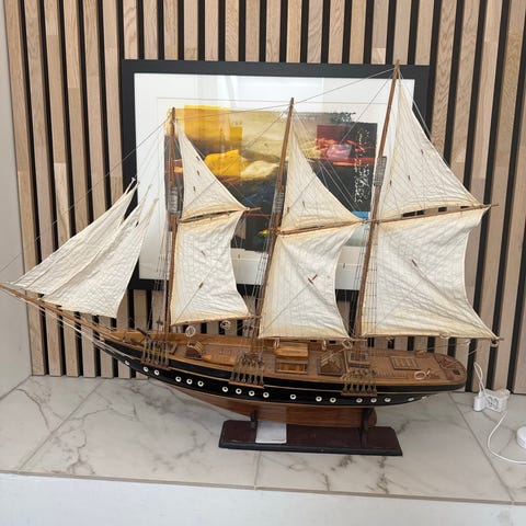 Modellskip i tre, utformet som et større seilskip med flere master og hvite seil. Skroget er bygget i tre med ulike tresjatteringer og detaljer som kanoner og rekker langs sidene. Skipet står montert på en enkel sokkel i tre som gjør det egnet til plassering på hylle, skap eller annet møbel. Passer som dekorativt innslag i stue, kontor eller andre rom der man ønsker maritimt preg. Ingen merkevare eller modellnavn er oppgitt.