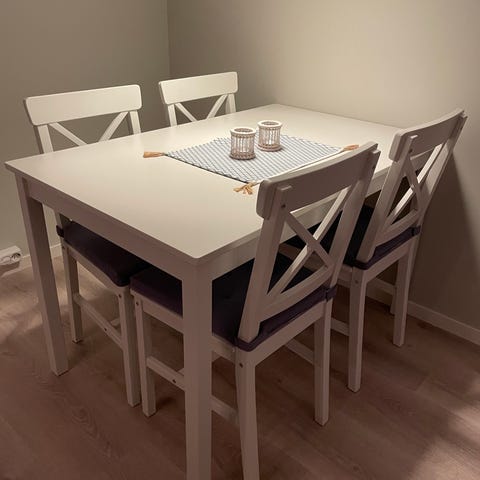 Hvitt kjøkkenbord med 3 stoler og en krakk