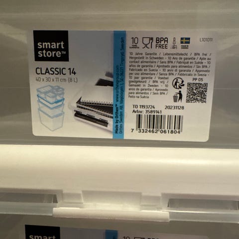 Oppbevaringsboks med lokk, laget av slitesterk, transparent plast som gjør det enkelt å se innholdet. Boksen kan stables, og klemmehåndtak holder lokket på plass. Kan romme 14 liter (30 cmx 40 cm x 18 cm).