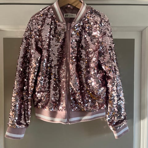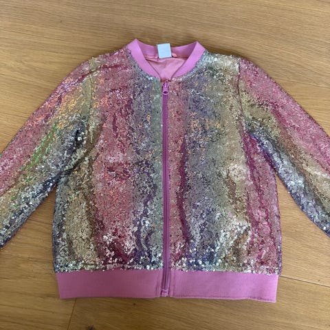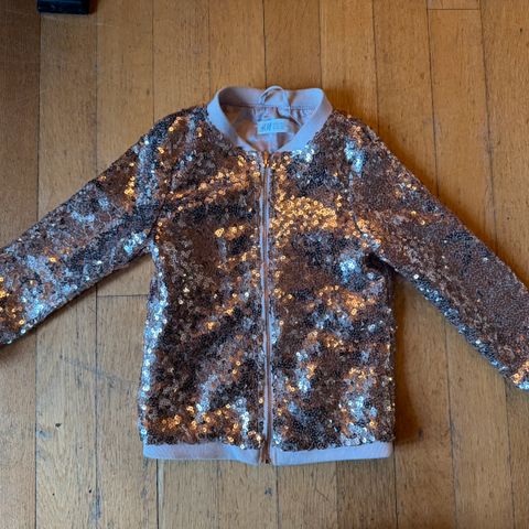 Rosa paljettjakke i str 110 fra H&M. Pent brukt, men litt misfarget på ytterst på begge ermene. Se bilde.