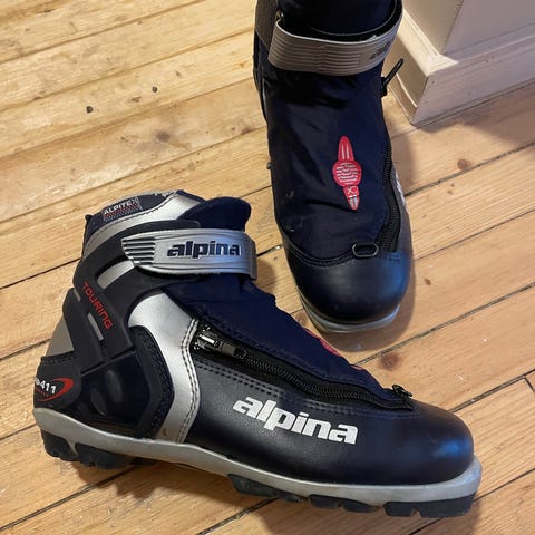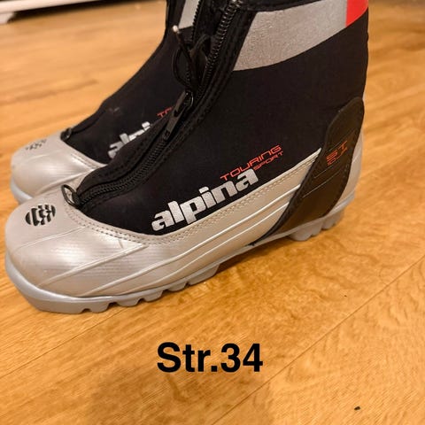 Alpina Touring skisko i størrelse 39. Modellen har overdel i tekstil og syntetisk materiale i svart og sølv. Skoene har glidelås i front og integrert gamasje som dekker lissesystemet. Sålen er tilpasset langrennsbindinger av touring-type. Egnet til klassisk langrenn og turbruk.
