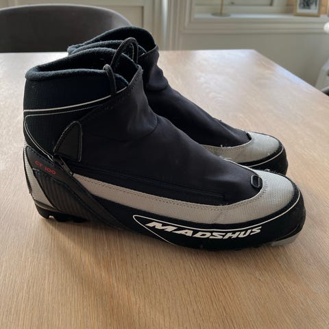 Madshus langrennsstøvler i størrelse 37. Støvlene har overdel i hovedsakelig hvitt materiale med blå detaljer og glidelås i front. Tå- og hælparti er forsterket i mørkt materiale. Passer til klassisk langrenn, med standard såle for bindinger som på bildet. Egner seg til bruk på tur og trening på ski.