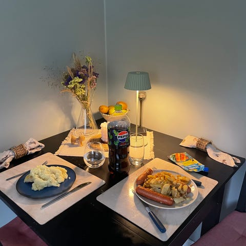 Bordet er 170 cm langt og 100 cm bredt på det bredeste.