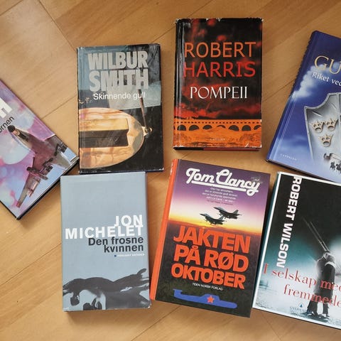 Bokpakke med spenningsromaner og krim av flere forfattere. Blant annet bøker av Wilbur Smith,