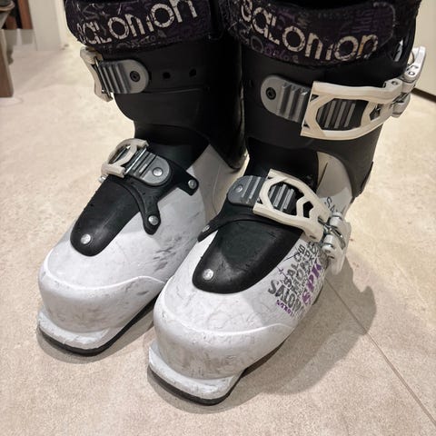 Salomon alpinstøvler i størrelse 23,5. Brukt, men masse bruk igjen! Støvlene har ytre skall i plast med to justerbare spenner på hver støvel.