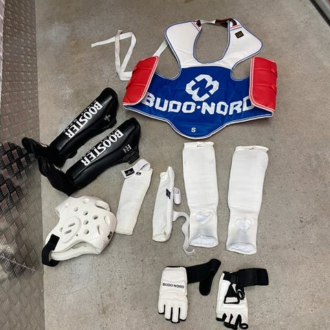 Top Ten boksehansker og Fighter leggbeskyttere med hjelm og fotskinn. Sett med røde og hvite boksehansker fra Top Ten, polstret og med borrelåslukking rundt håndleddet. Leggbeskytterne fra Fighter er svarte med hvite kanter og borrelåsreimer for justering. I tillegg følger det med hvit hjelm/hodebeskyttelse og svarte fotskinn med borrelås. Utstyret er egnet til kampsporttrening og sparring der det er behov for beskyttelse av hode, hender, legger og føtter.